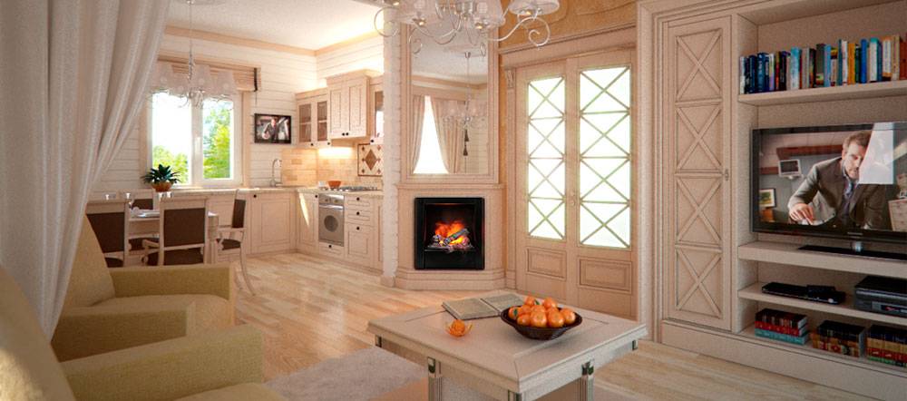 При этом каминную зону отдыха следует располагать у окна. Встроенный камин в гостиной вполне компактный и идеально разделяет пространство помещения. Доминирующим цветом в таком помещении можно выбрать один из оттенков молочного цвета.