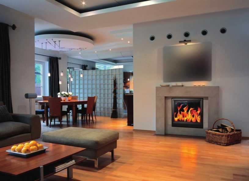 Камины с панорамной топкой в интерьере гостиной