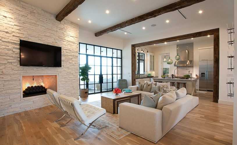 - Кантри. В деревенском стиле интерьера камин смотрится неброско, немного грубовато. Он облицовывается туфом или ракушечником. Обычно над очагом располагают деревянные балки, а рядом с ним — поленницу для дров.