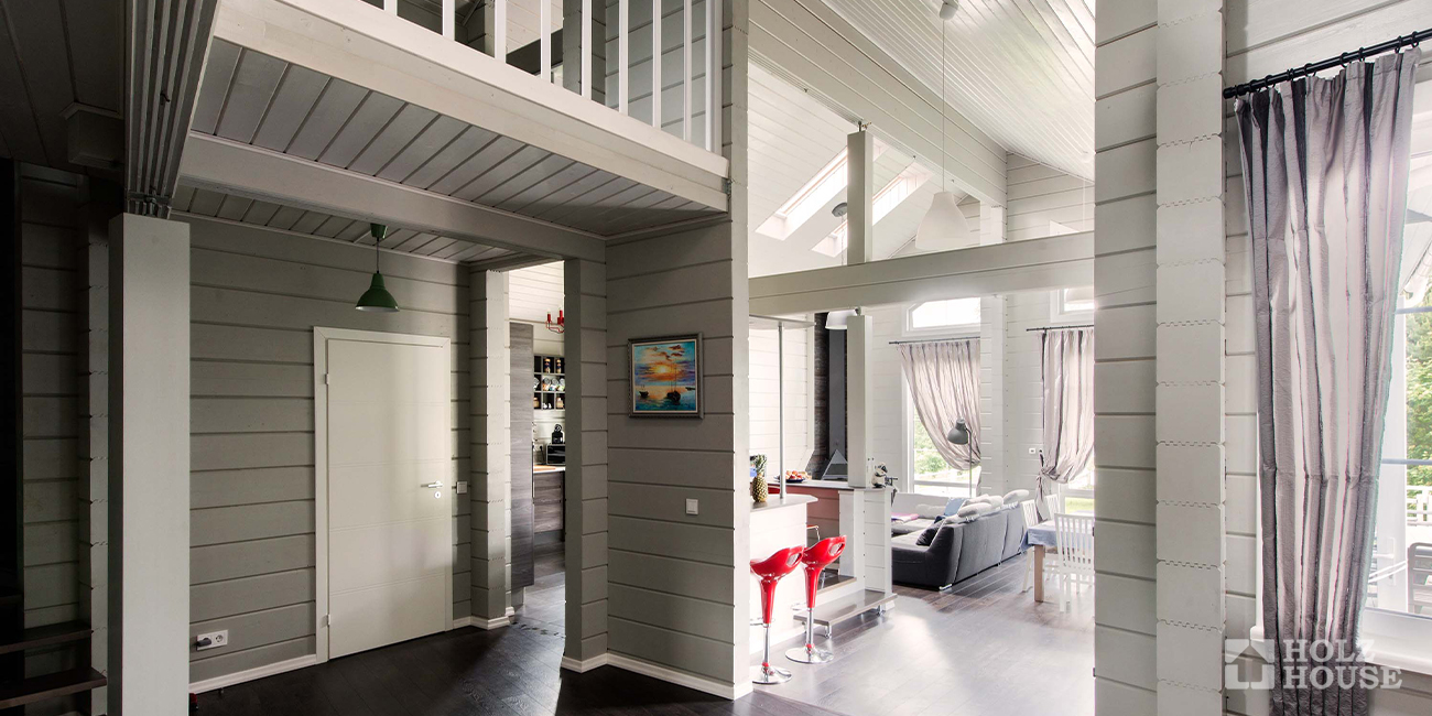 - Высокие потолки. Благодаря высоте потолков, умноженной на 2, основная комната дома визуально кажется гораздо просторнее, чем есть на самом деле.