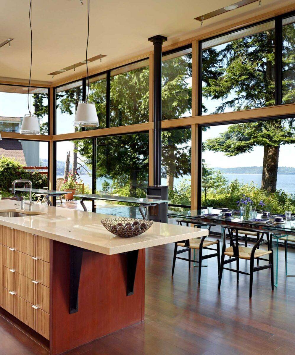Современные дома с панорамными окнами гармонично примут скандинавский стиль, минимализм, хай-тек. Характерно отсутствие ярких цветов, много света, четкие линии и пропорции, насыщение современной техникой, лаконичность и отсутствие большого количества предметов.