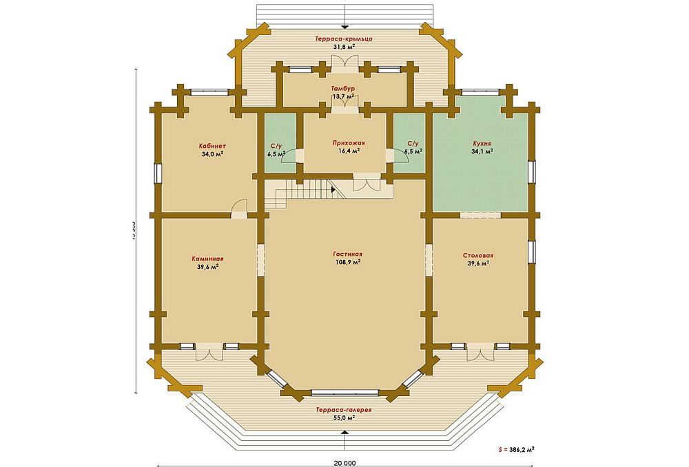 В таких проектах вокруг гостиной (столовой) расположены остальные комнаты первого этажа. Это исключает необходимость наличия коридора