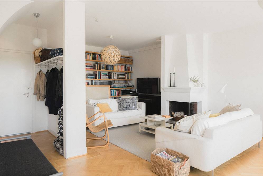 Так как скандинавский стиль не предполагает наличие помещений большой площади, он идеально подойдёт для оформления помещений в стандартных малогабаритных квартирах. При этом некоторые нюансы их архитектуры и дизайна вполне подойдут для того, чтобы быть использованными для оформления гостиной в описываемом стиле. Например, к ним можно отнести элементы кирпичной кладки или фрагменты бетонной плиты, окрашенные в белый цвет.
