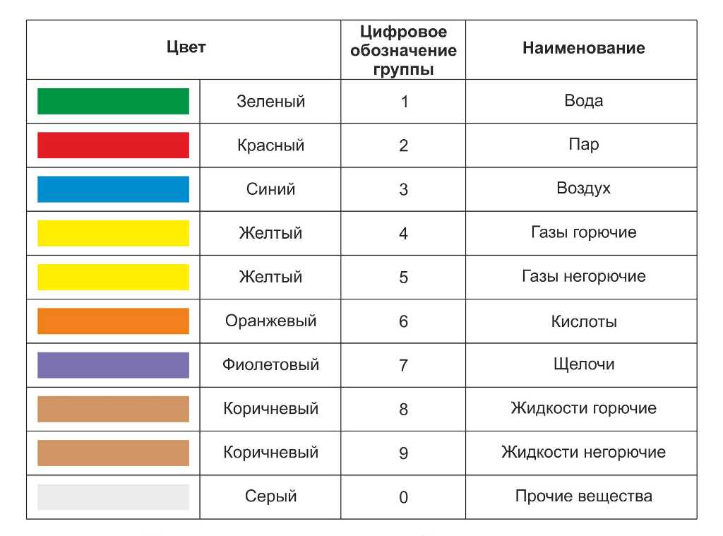 Цветовое обозначение трубопроводов согласно Таблице 1 из упомянутого выше ГОСТа выглядит так.