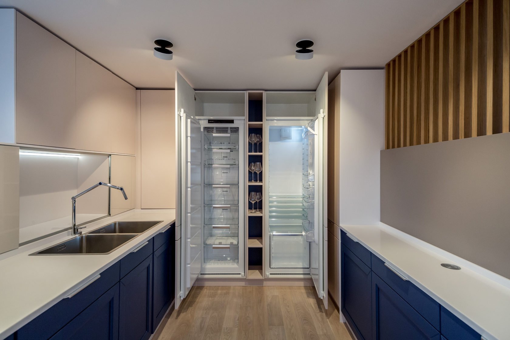 Встроенный холодильник в коридоре, используемый в качестве мини-бара. Стеклянные полки и подсветка создают эффектный акцент.