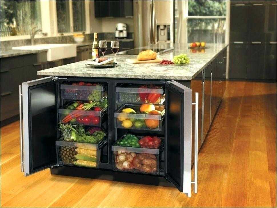 В частности, холодильник можно спрятать в шкаф под рабочей поверхностью. Для этой цели обычно приобретают два небольших, до 80 см высотой агрегата и ставят их рядом друг с другом. Можно разделить их тематически, например, в правой части – мясо и молочные продукты, в левой – фрукты и овощи. Это выглядит оригинально, очень необычно и позволяет избежать в интерьере перепада по высоте. Места для хранения продуктов, конечно, будет немного. Кроме того, чтобы достать что-то, каждый раз придется наклоняться или приседать.
