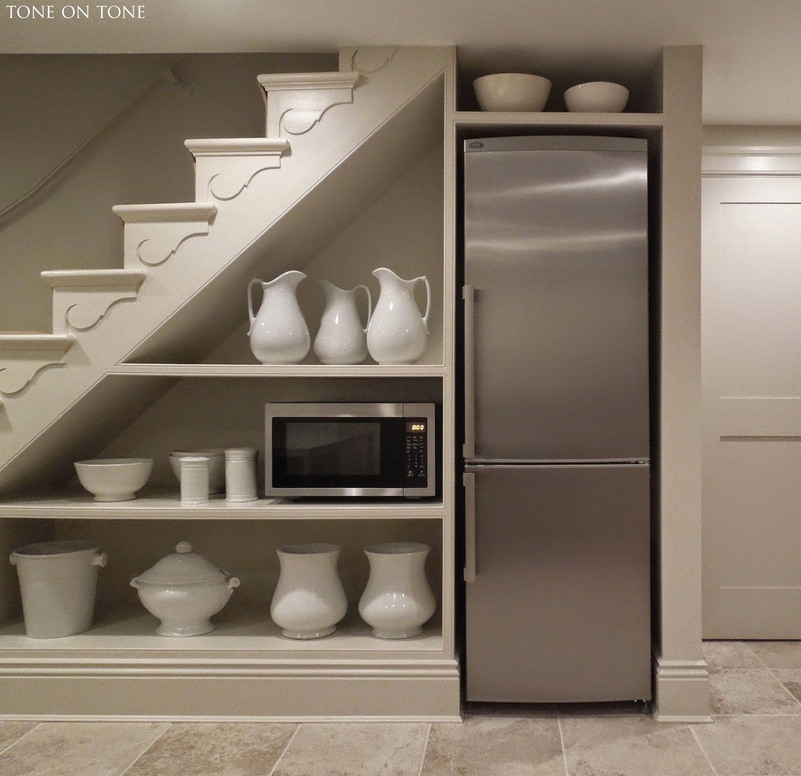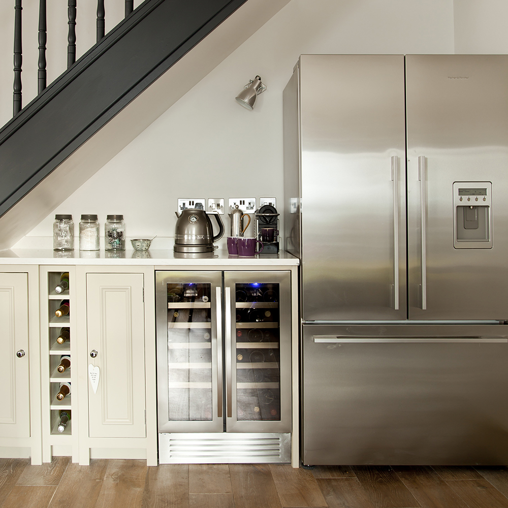 - в случае, если вы живете в особняке или двухэтажной квартире, и на вашей кухне имеется лестница, ведущая наверх, можно встроить холодильник в лестницу