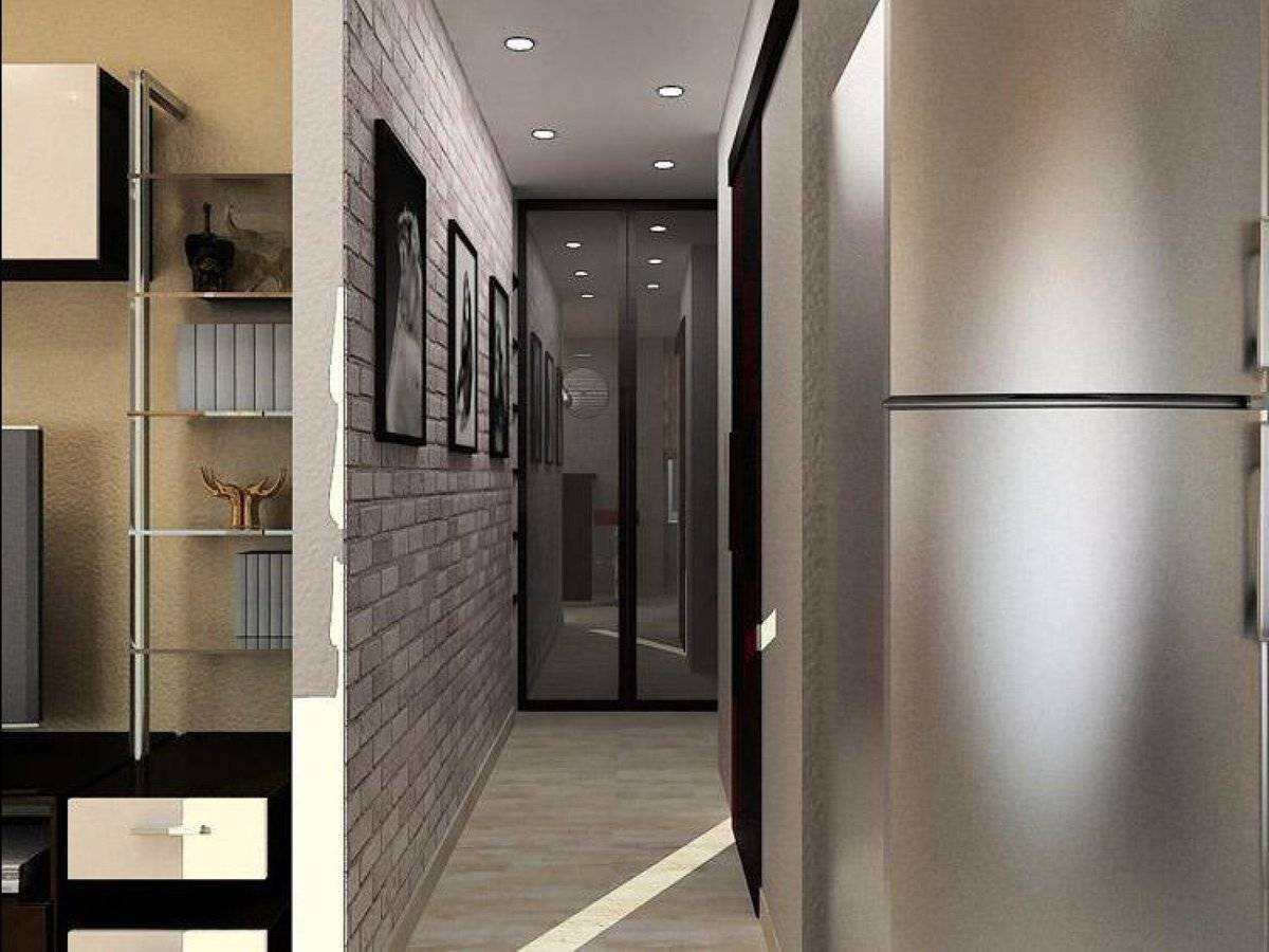 Идея с встроенным холодильником-столешницей. Это не только функционально, но и придает оригинальности интерьеру коридора.