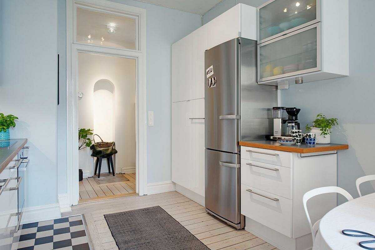 Этот способ размещения холодильника подойдет, если на кухне нет места, а коридор, примыкающий к ней, довольно просторный. Технику следует размещать таким образом, чтобы жильцы квартиры могли свободно передвигаться. Дверцы прибора должны легко открываться, не сталкиваясь при этом с посторонними предметами. Для установки агрегата также подходит чулан или кладовка.