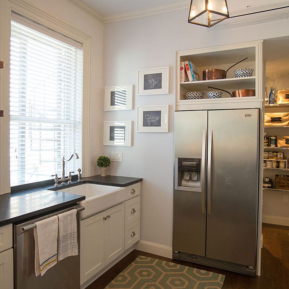 , заполнив пустующее место и экономя тем самым пространство; - встроить холодильник в мебель