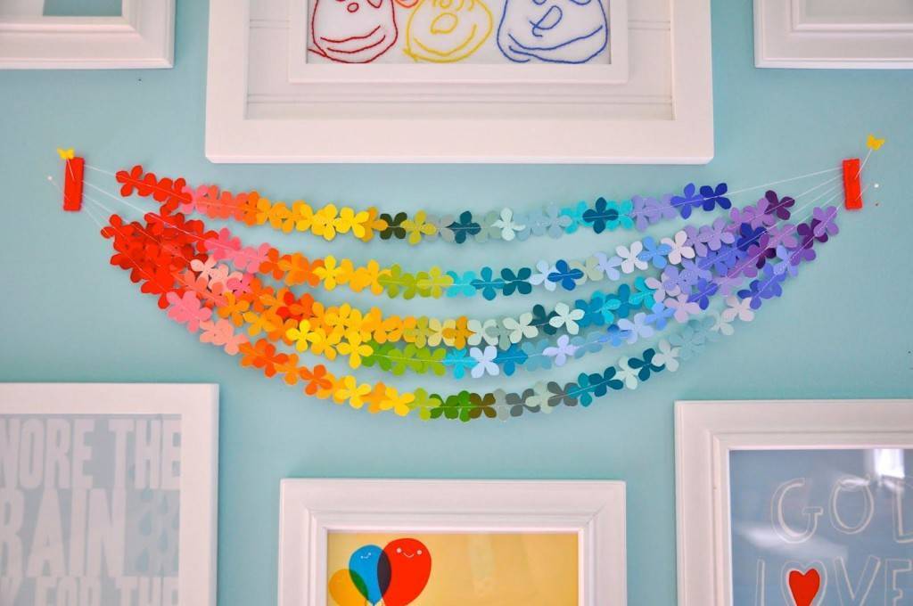 Наиболее оригинальный декор стены своими руками можно выполнить с использованием бумажных аппликаций. Это могут быть как смелые бумажные цветы, так и любые другие фигуры.