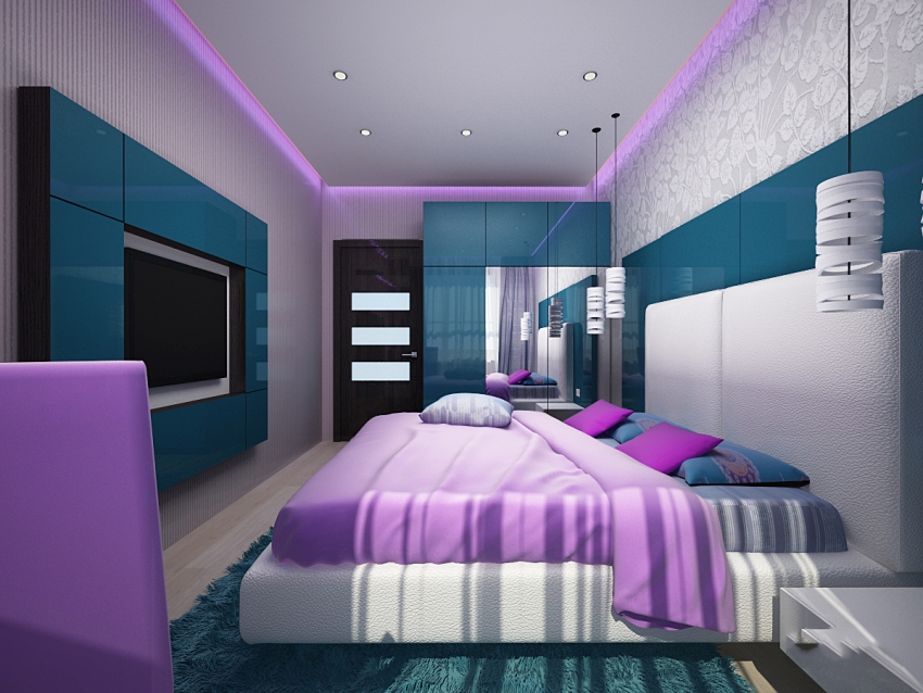 Помимо классической однотонной отделки с добавлением яркого акцента в узкой спальне можно применить и другие дизайнерские решения.