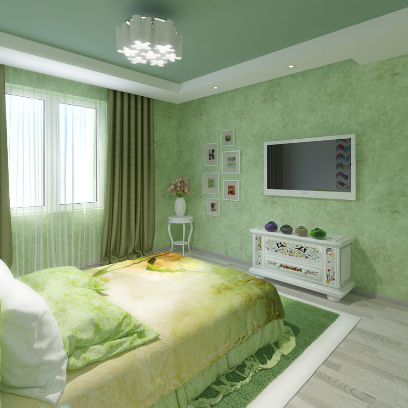 Салатовым цветом нередко оформляются стены, кроме того, он может встречаться при подборе мебели, например, на прикроватных тумбах.