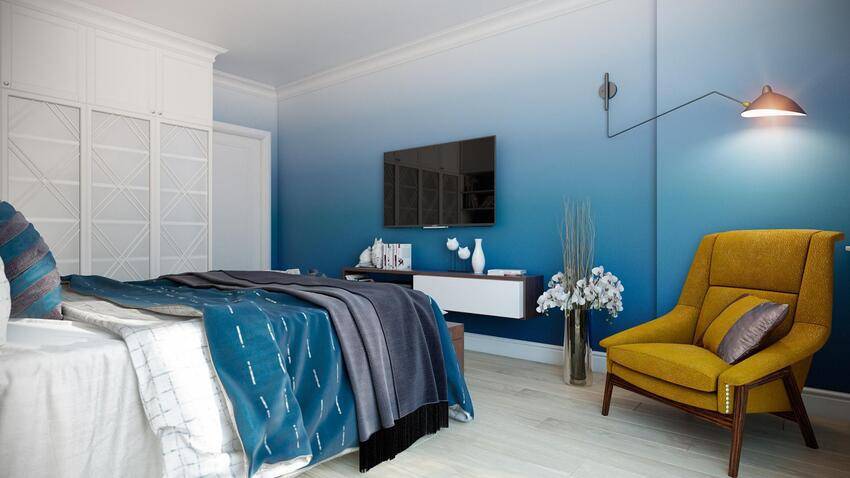Использование градиента. Этот прием позволяет создать постепенный переход от светлых оттенков к темным или наоборот. В небольших комнатах не следует оформлять спальню с помощью темных цветов. Поэтому градиент организовывается в средней палитре красок и выполняет переход к более светлым цветам. Если же в узкой комнате присутствуют высокие потолки, допускается визуальное расширение пространства посредством нанесения темного цвета на середину стены, высветляя ее к верху и к низу.