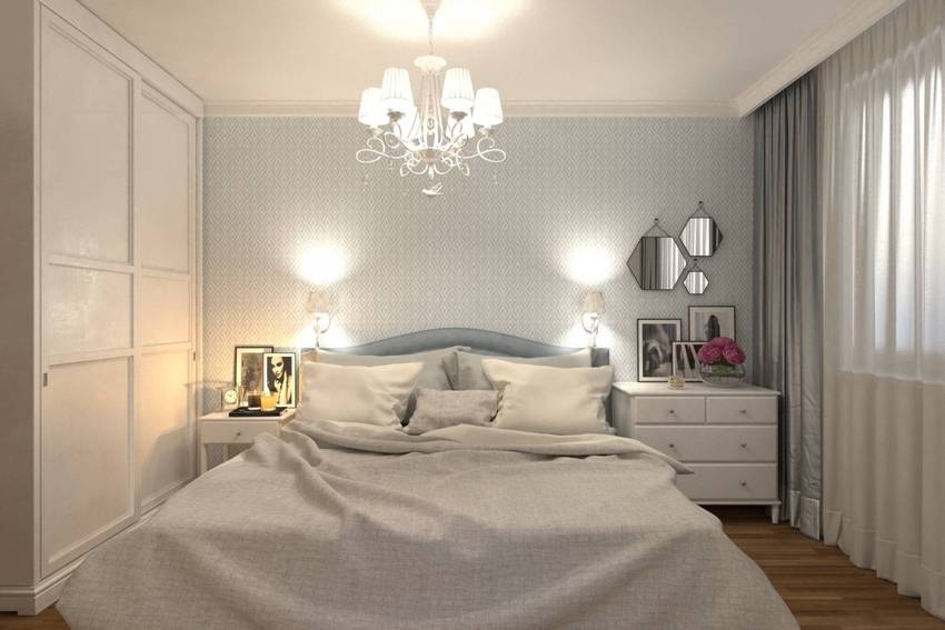 В узких спальнях стандартным решением считается выбор оттенков из пастельной цветовой гаммы, которые могут дополняться контрастными деталями.