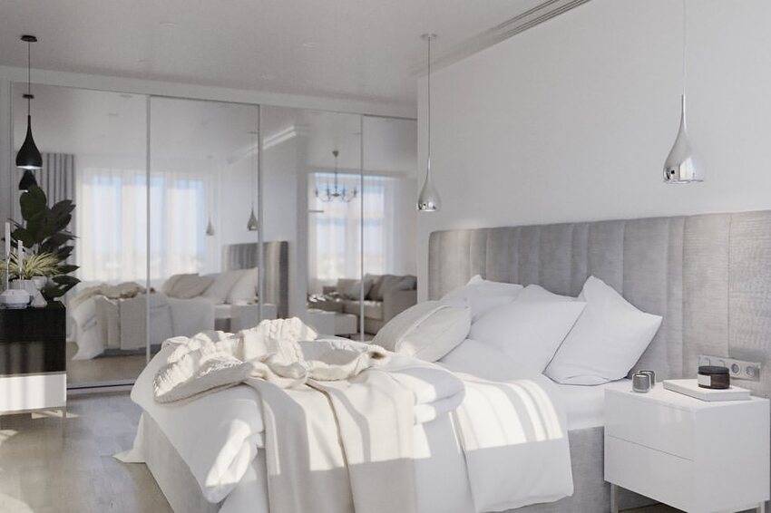 На фото показан пример спальни в современном стиле, где зеркальная поверхность во всю стену используется для визуального расширения комнаты.