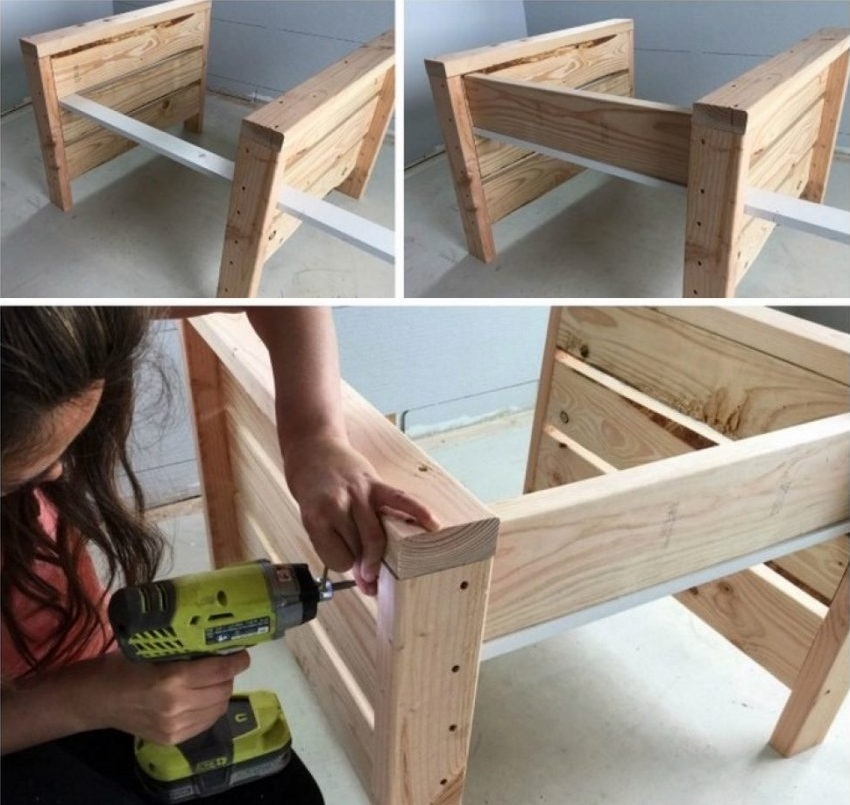 Части поддона, распиленного для спинки, необходимо соединить крепежами, используя шуруповерт. Боковые части или подлокотники изготавливаются из досок и крепятся к основанию.