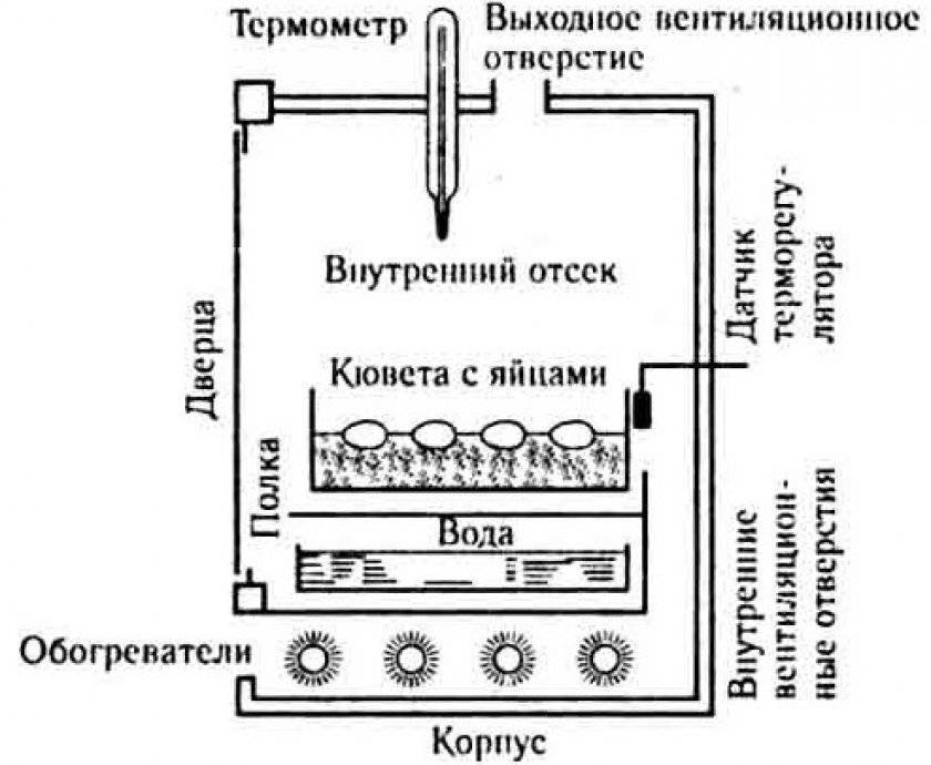 Потребуется сделать только вентиляционные отверстия, установить лампы накаливания, вентилятор, лоточки с водой и терморегулятор.