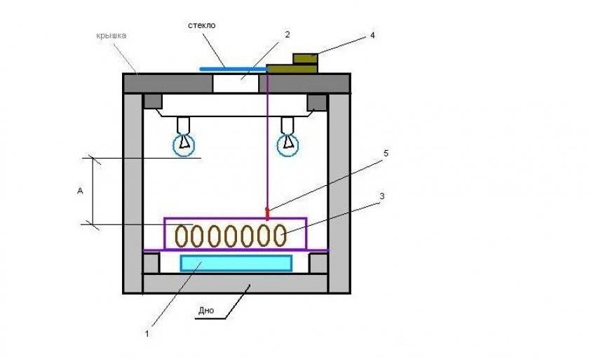 - В соответствии с размерами коробки вставляется три или более лампочек мощностью в 25 Вт. Располагаются они в 15 см от лотка.