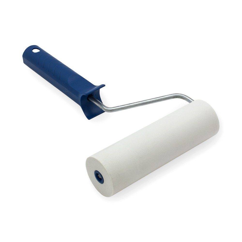 | Прижимной валик. Этот специфический инструмент служит только для разглаживания обойных полотнищ. Длина его бобина может быть от 15 сантиметров до 30 см. Для легких обоев применяется поролоновый валик, для тяжелых полотнищ – резиновый. | |