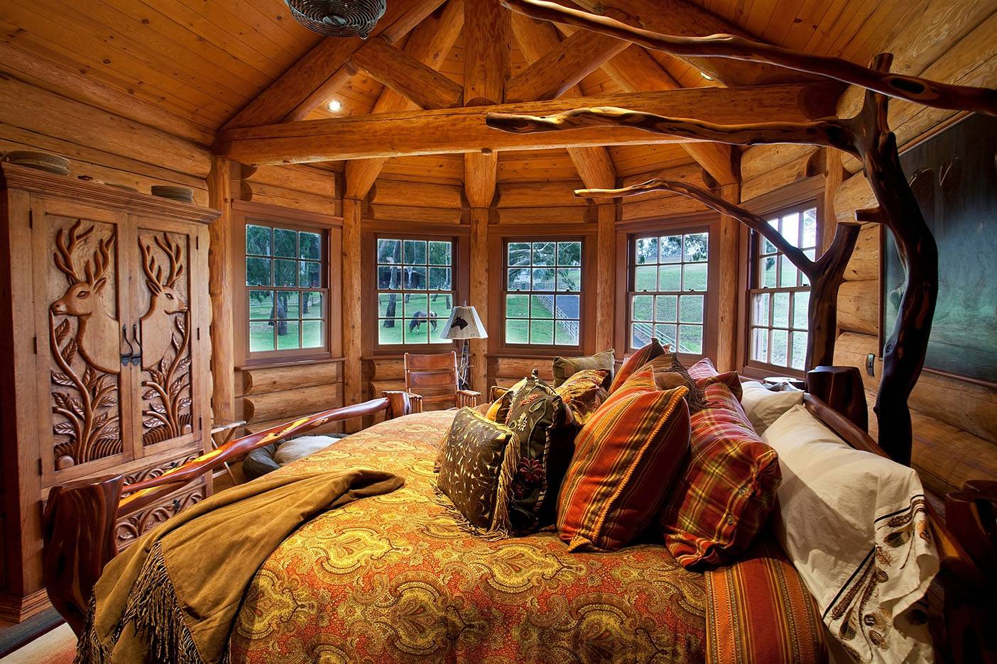 «Суровый» рустикальный интерьер спальни из состаренного бруса. И только светлая ниша с коллекцией клеток для птиц зрительно «облегчает» немного мрачный дизайн комнаты из темного дерева.