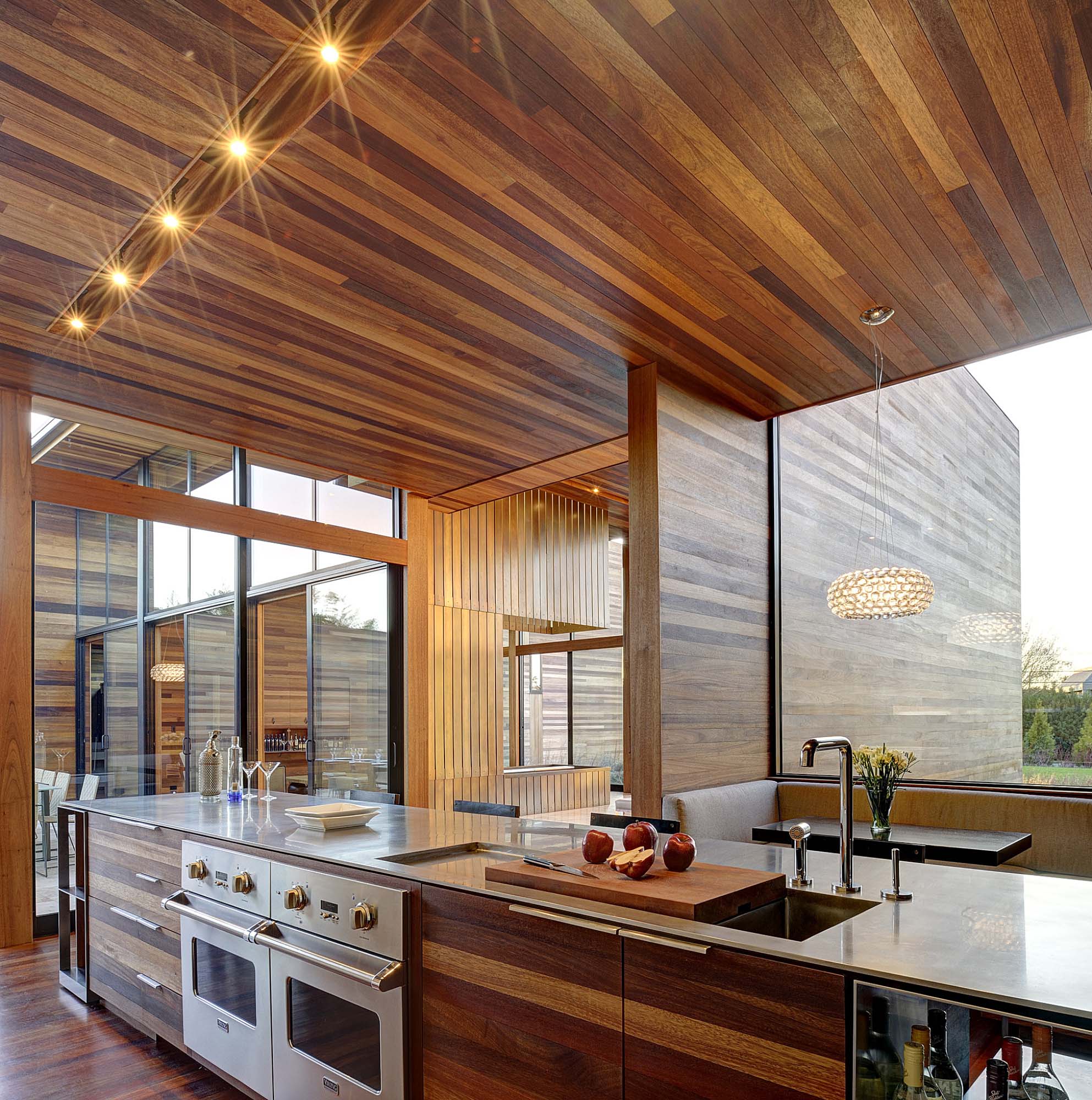 Деревянные фасады в тон стенам визуально делают кухню единым целым. Кажется что мебель встроена в стены дома. И только отличие в направлении фактурного рисунка свидетельствуют о том, что это не так.