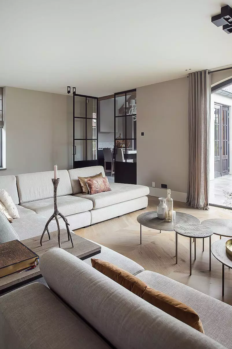 Мягкая мебель в гостиной в нордическом стиле отличается минималистичным дизайном светлых оттенков (песочного, молочного, серого).