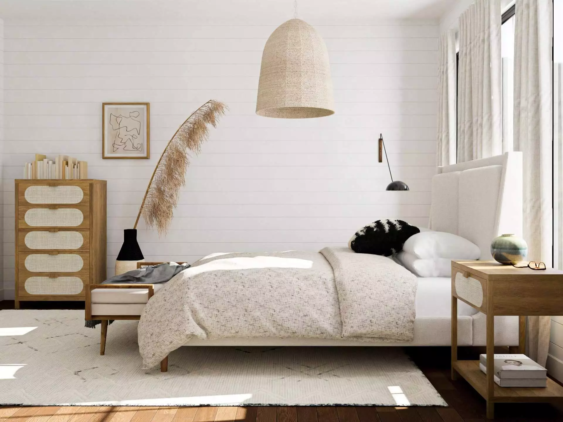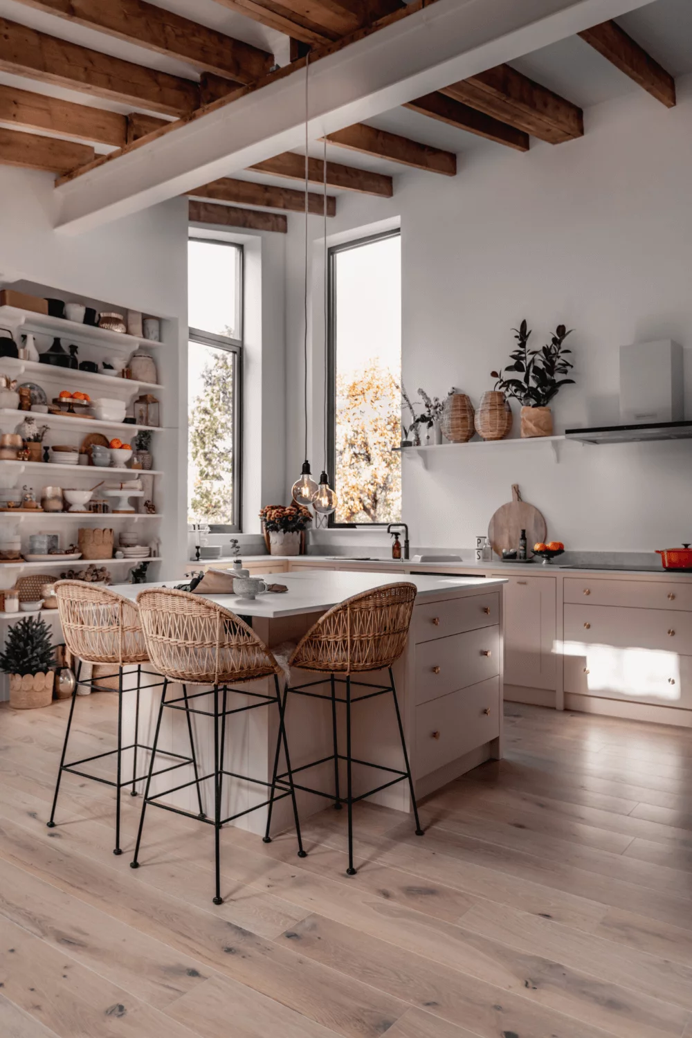 Стиль более остальных приближен к привычному нам скандинавскому интерьеру. В основе дизайна: обилие света, оттенки белого, от молочного до белоснежного, использование экологичных материалов. Текстиль подбирается льняной или грубый хлопковый базовых природных оттенков. Характерны деревянные детали и чёткая геометрия.