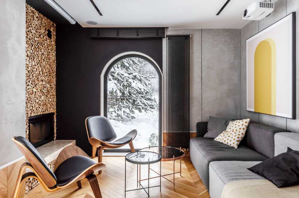 В случае с небольшой гостиной важно не загромождать комнату мебелью, расположив здесь журнальный стол, небольшой диван и пару пуфов. Шкафы лучше заменить полками открытого типа, дополнив интерьер черно-белыми фотографиями и металлическими светильниками