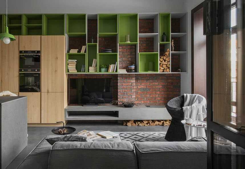 - Стеллажи – отличный вариант. Они не только будут служить зонами хранения, но и сделают пространство более «воздушным».