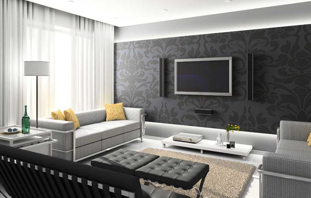 Оформление гостиной в современном стиле можно назвать полной противоположностью предыдущему примеру. В этом дизайне главенствуют простота, сдержанность, ненатуральные материалы и чёткие графические линии. На первый взгляд такое помещение немного напоминает офис, поэтому для создания более уютной обстановки следует дополнить современную технику и трансформирующуюся мебель ковровым покрытием и мягкими подушками.