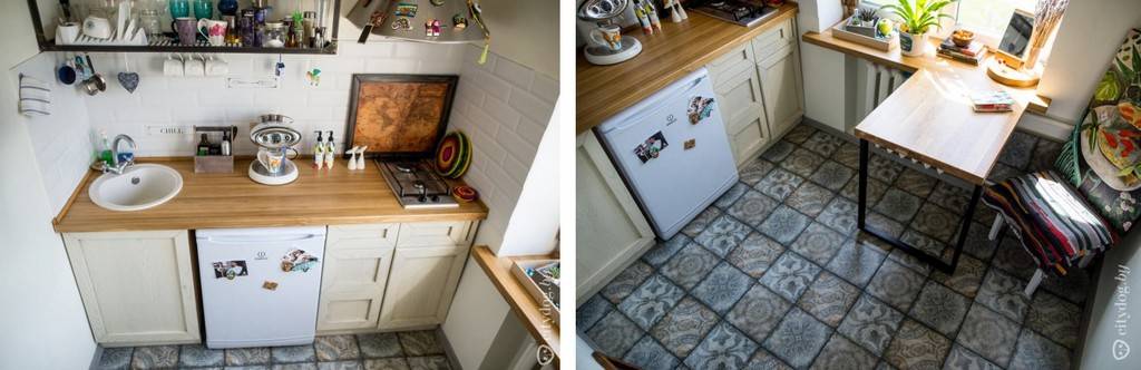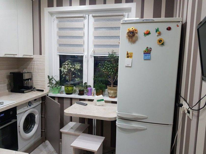 При небольшом помещении кухни, некоторые предметы или приборы можно вынести в другие помещения, например холодильник – в коридор, а обеденную зону частично объединить с лоджией
