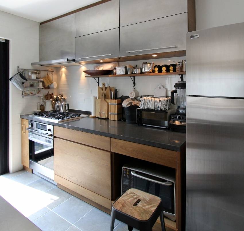 Фактически добавит необходимого пространства на кухне уменьшение нижних шкафчиков. Вместо большого громоздкого холодильника, возьмите небольшой, до 60 сантиметров в ширину, или маленький, который можно спрятать под столешницу.