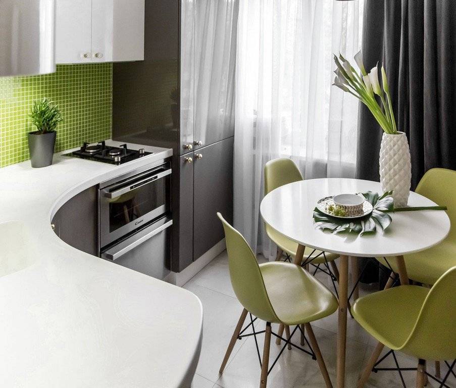 Важно, чтобы предмет гармонично сочетался с другими элементами и был удобен. Для маленькой семьи вполне подойдёт небольшой квадратный или круглый столик с отдельными стульями