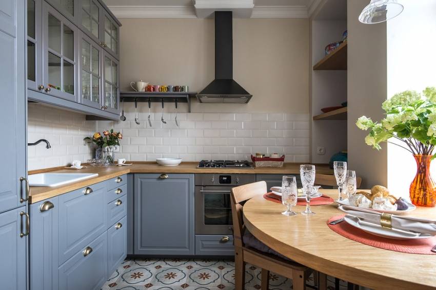 Оптимальный вариант — гарнитур угловой. Он будет функциональным при любом типе планировки. Это компактный вариант, созданный в подходящем стиле именно для маленького пространства. Устанавливают гарнитур в соответствии с проектом, чаще возле окна с учётом расположения труб, холодильника и газовой плиты.