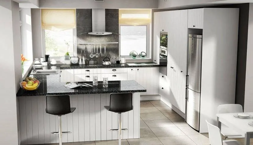 - П-образная планировка кухни-гостиной представляет собой размещение кухонного гарнитура вдоль трех стен с захватом двух углов. Занимаясь таким дизайном, специалисты обычно выделяют рабочую зону. Чтобы помещение выглядело не так тесно, одну боковину гарнитура укорачивают и делают барной стойкой. Желательно, чтобы расстояние между сторонами гарнитура составляло не менее 1,2 метра, иначе кухня будет тесной.