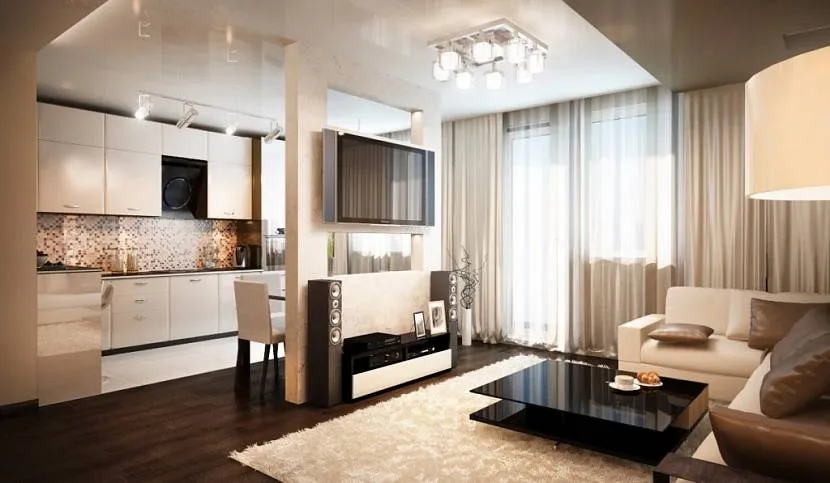 На фото – дизайн кухни-гостиной в 20 кв. м с зонированием раздвижными перегородками.