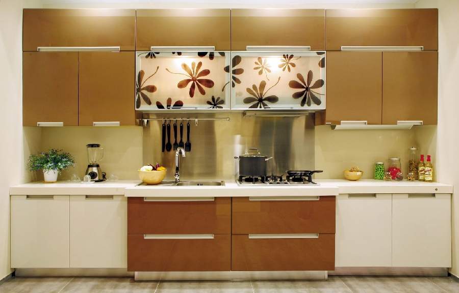 Отделка помещения кухни заключается в окрашивании стен и дверей в светлые тона. Пол должен быть контрастным по отношению к стенам. При отделке пола у вас есть два вариант – керамическая плитка и влагостойкий ламинат (специально предназначенный для кухонных помещений). Что касается потолка, то он должен быть светлым и гладким. Лучше отдать предпочтение какому-нибудь современному варианту, например, двухуровневому потолку из гипсокартона или натяжному потолку.