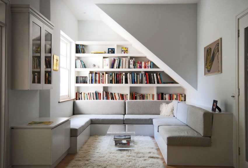 В малогабаритной квартире гостиную и рабочий кабинет легко объединить в общее пространство. Выберите для кабинета уголок с достаточным дневным освещением и обставьте его подходящим столом.