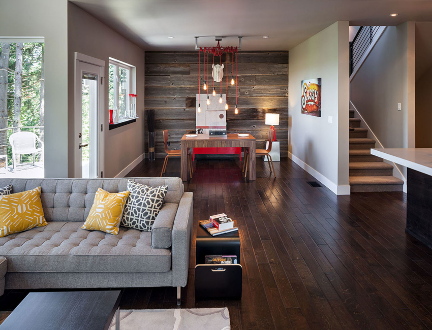 Для отделки пола лучше использовать универсальный вариант – дерево или ламинат под натуральную или выбеленную древесину.
