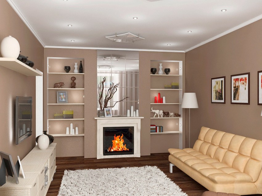 Оригинально выглядит комбинированный потолок, как показывают фото интерьера маленькой гостиной. По периметру создается гипсокартонная конструкция, заполненная натяжной зеркальной пленкой. Бюджетным вариантом является традиционное окрашивание поверхности в белый цвет.