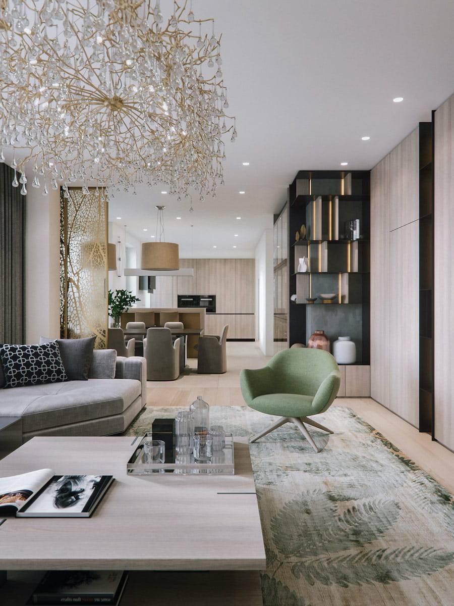 В дизайне популярно оформление с легким налетом роскоши. Немногочисленная мебель и декор сделаны из качественных дорогих материалов. Лаконичный интерьер эффектно дополнит столешница из мрамора или мягкая обивка из кожи. Массивная люстра с позолотой естественно вписывается в скромный минимализм.