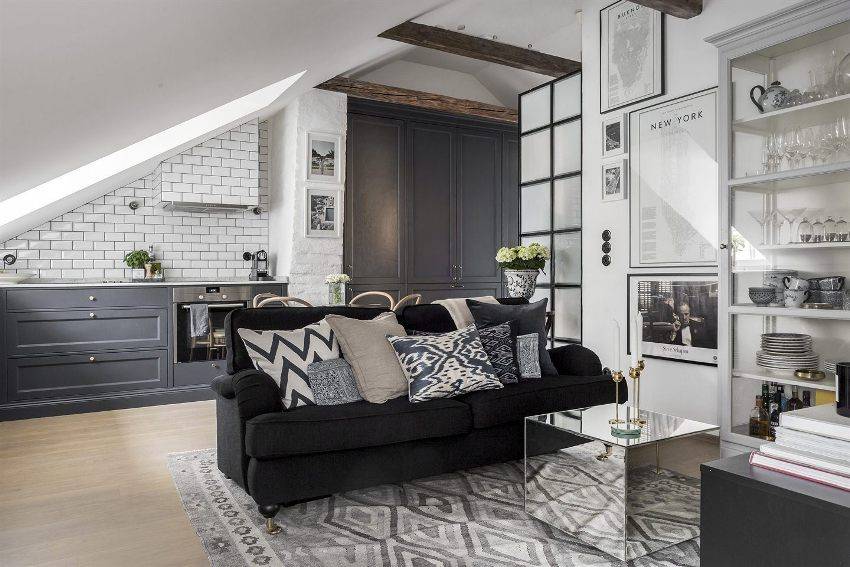 Обычно, в жилье такого размера гостиную соединяют с кухней-столовой. Помимо кухонного гарнитура, используется также удобная барная стойка, которая также применяется в качестве стола. Возле стойки можно поставить диван, либо установить его напротив, если телевизор будет встроен в одну из тумб гарнитура. Вместо кресла лучше приобрести пуф, который можно поставить возле дивана и передвинуть при необходимости.