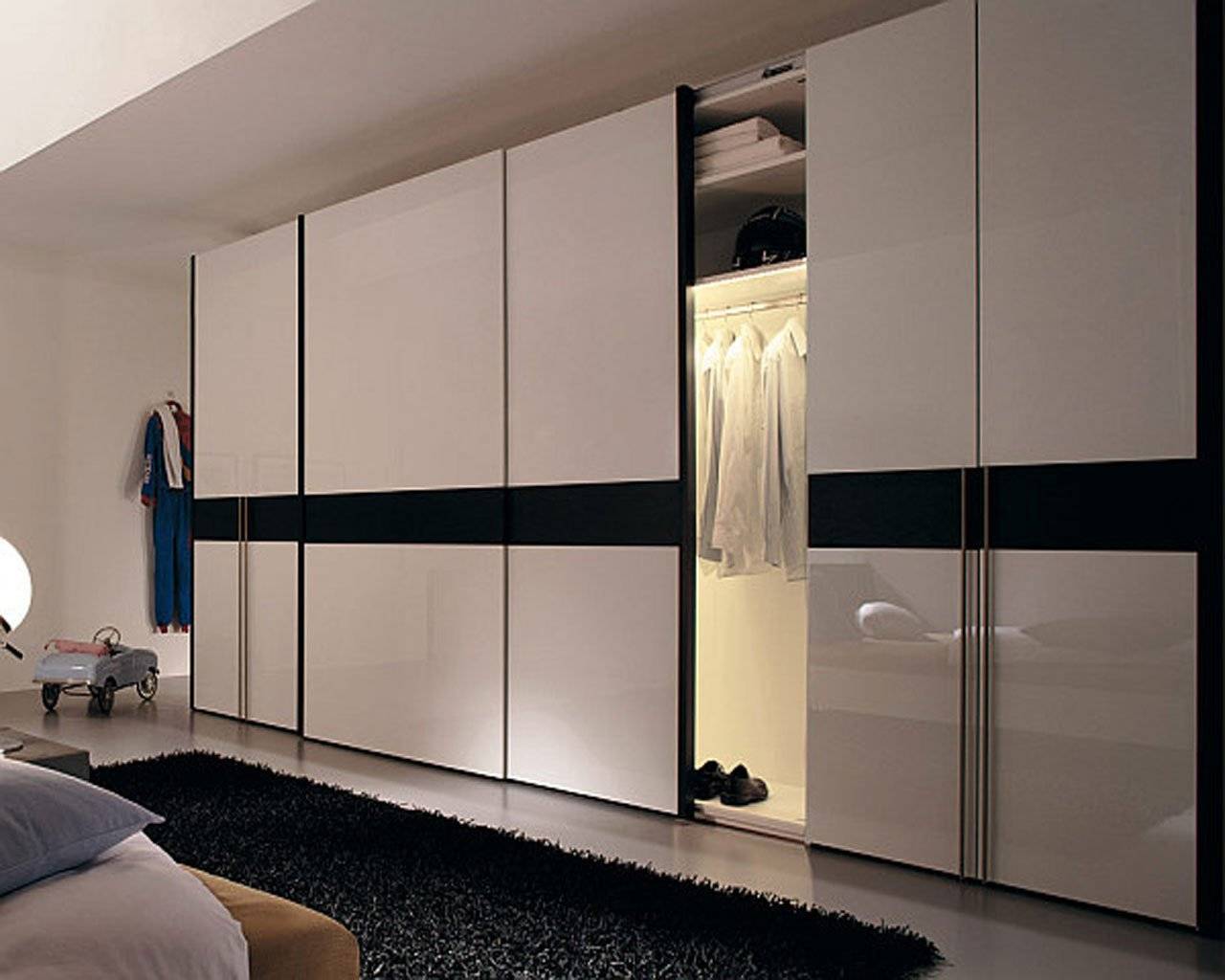 интересным решением станет использование светодиодной ленты, так подсветка по всему периметру шкафа создаст приятный и мягкий свет в комнате.