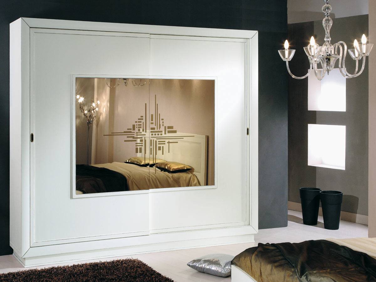 В дизайне спальни с белой кроватью такой шкаф играет одну из главных ролей смысловых акцентов, имитирующих городские постройки с окнами, встроенными в крест наличников, и характерны для многих старых городов. За прямоугольной конструкцией из белых планок матовое стекло приглашает человека заглянуть в свой мир, но в то же время надежно скрывает от посторонних глаз тайны хозяев.