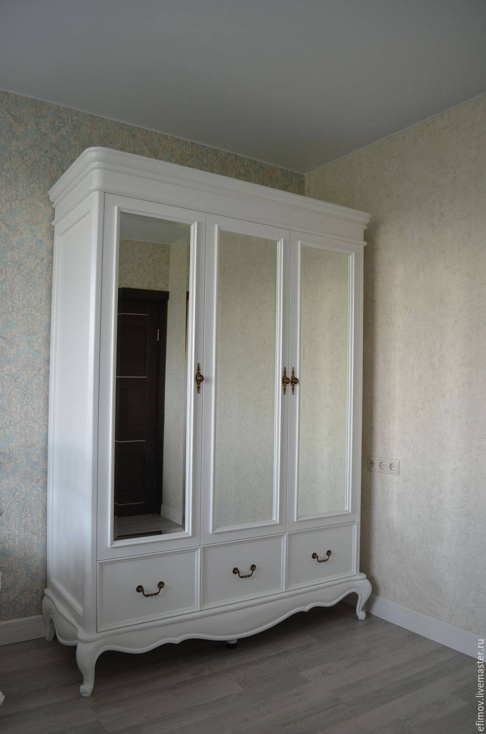шкаф в белых тонах может стоять вдоль стены, но обратит на себя внимание при наличии зеркальных панелей;