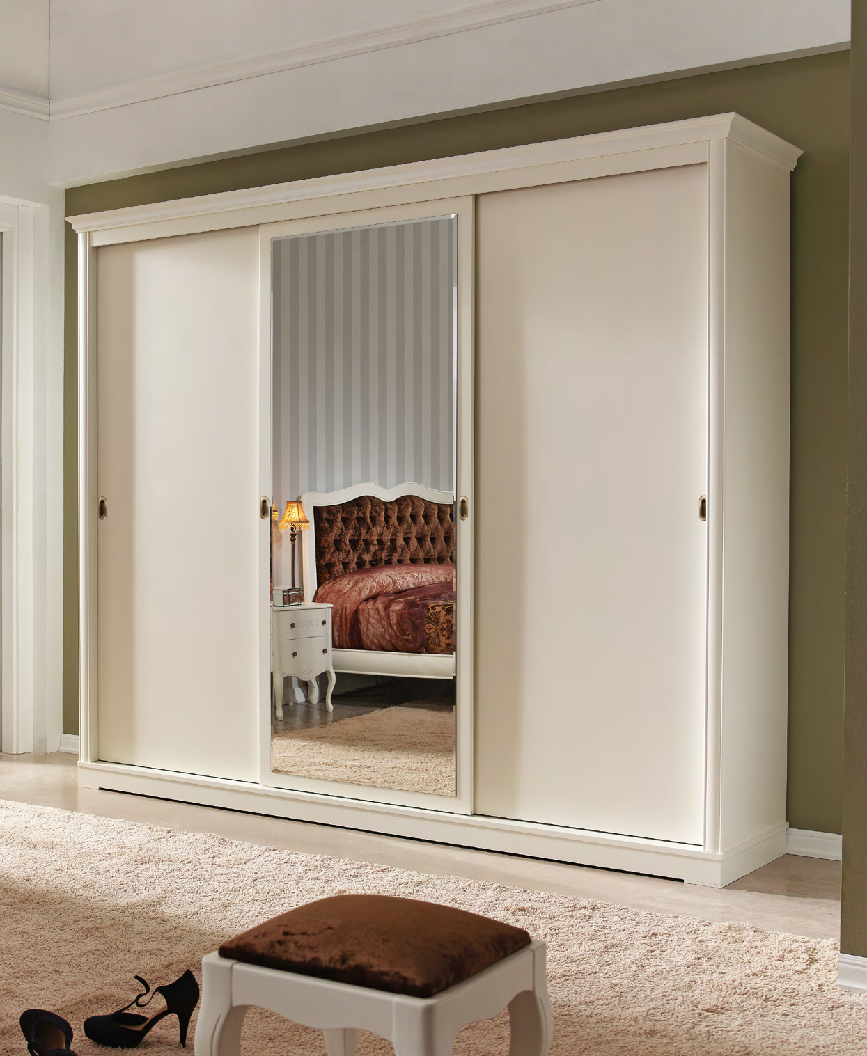 Красиво смотрится белая спальня, выдержанная в неоклассическом стиле, который характеризует стиль большого города с большими традициями, выделяясь в каждом элементе интерьера. Здесь установлено все, что необходимо в таком помещении. В большом четырехсекционном шкафу есть полки, ящики, есть место для платьев, блузок и брюк.