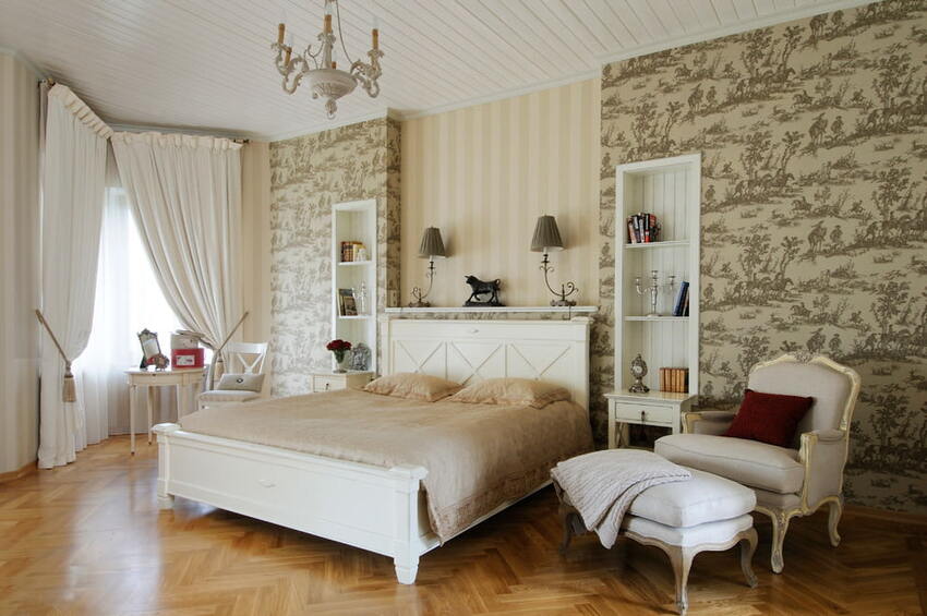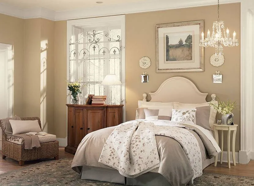 Этот стиль больше подойдет для загородных домов. Тем более, что деревенский интерьер спальни в светлых тонах со светлой мебелью и оттенком старины становится все более популярным.