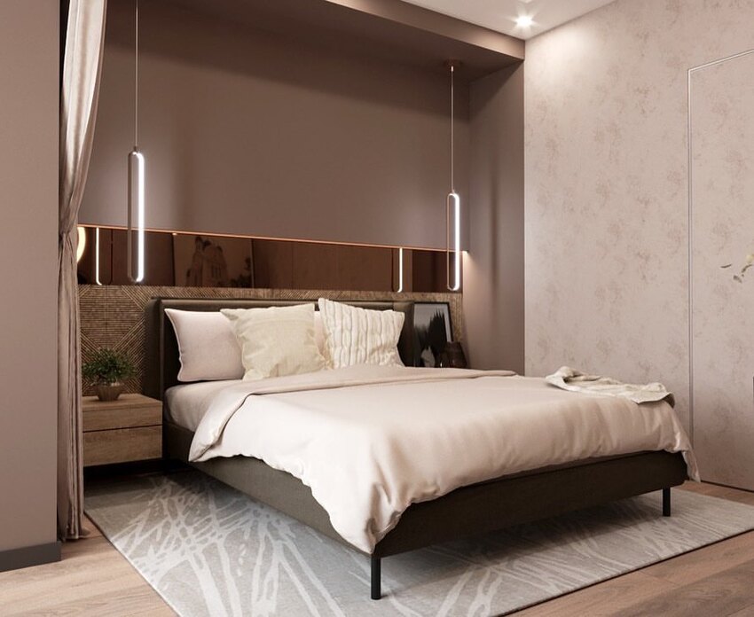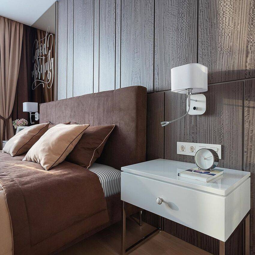 В коричневом оформлении важно правильно расставлять акценты и чередовать цвета. В маленькой спальне светлый должен преобладать, а темные тона служить акцентами