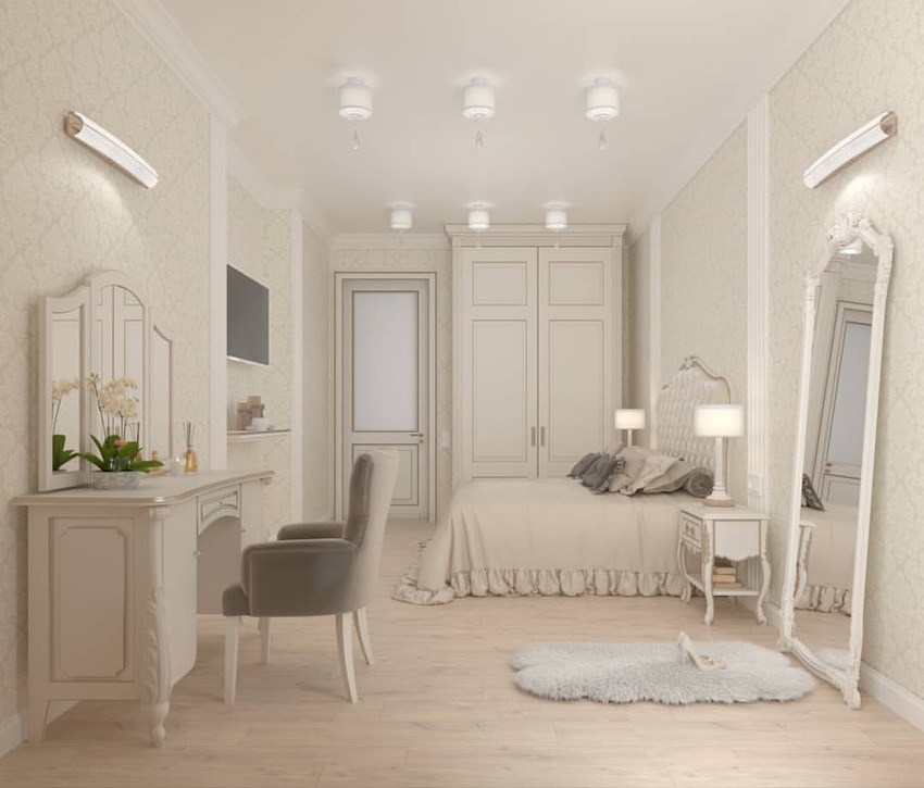 Элегантный интерьер спальни со светлой мебелью – воплощение романтизма, утонченности и эстетичного совершенства. Он особенно актуален при обустройстве небольшого пространства. Светлая кровать, шкаф, тумбы и прочие элементы выглядят аккуратно и не загромождают пространство.